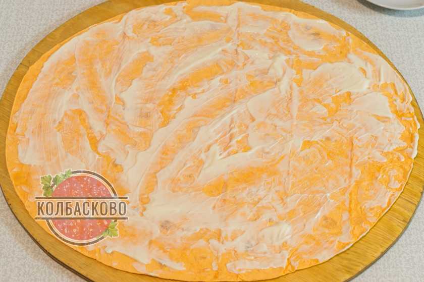 - Отступив 10–12 см от края, нанести соус: смешать майонез, кетчуп, травы и чеснок.