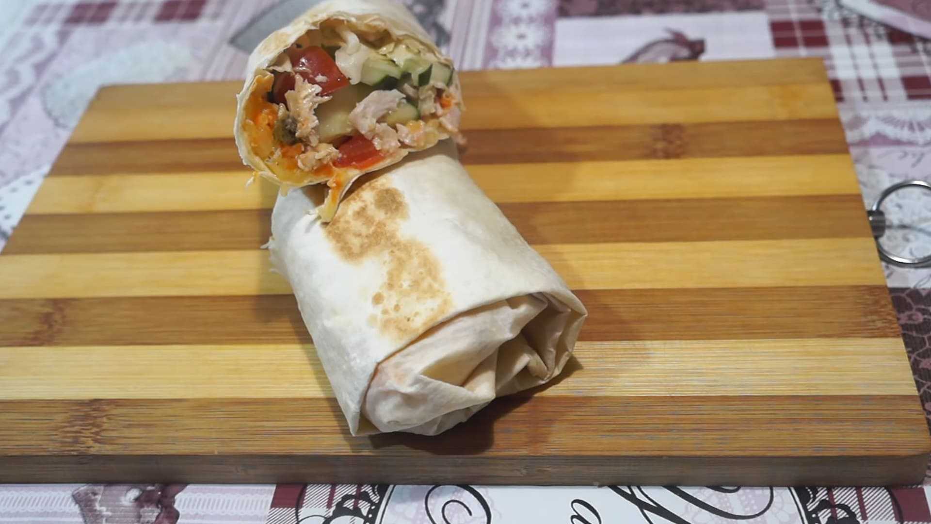 Теперь остается аккуратненько завернуть лаваш и у нас получилась почти готовая шаурма. Делаем их столько, пока не закончатся все подготовленные Вами компоненты.