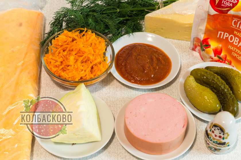 5.Сначала мы выложим морковку, затем колбасу, капустный салат, огурцы и лук. Последовательность, в общем, не имеет значения. Полить кетчупом.