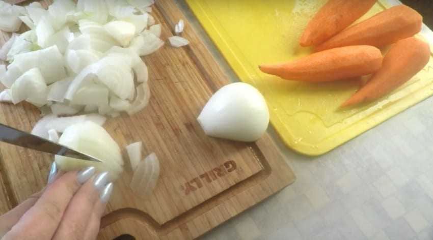 - В чашу засыпать луковицу и морковку, порезанные соломкой.