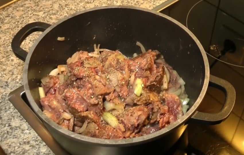 3. Нарежьте лук полукольцами и отправьте его в казан. Поперчите и перемешайте массу. Жарьте на среднем огне 10 минут.