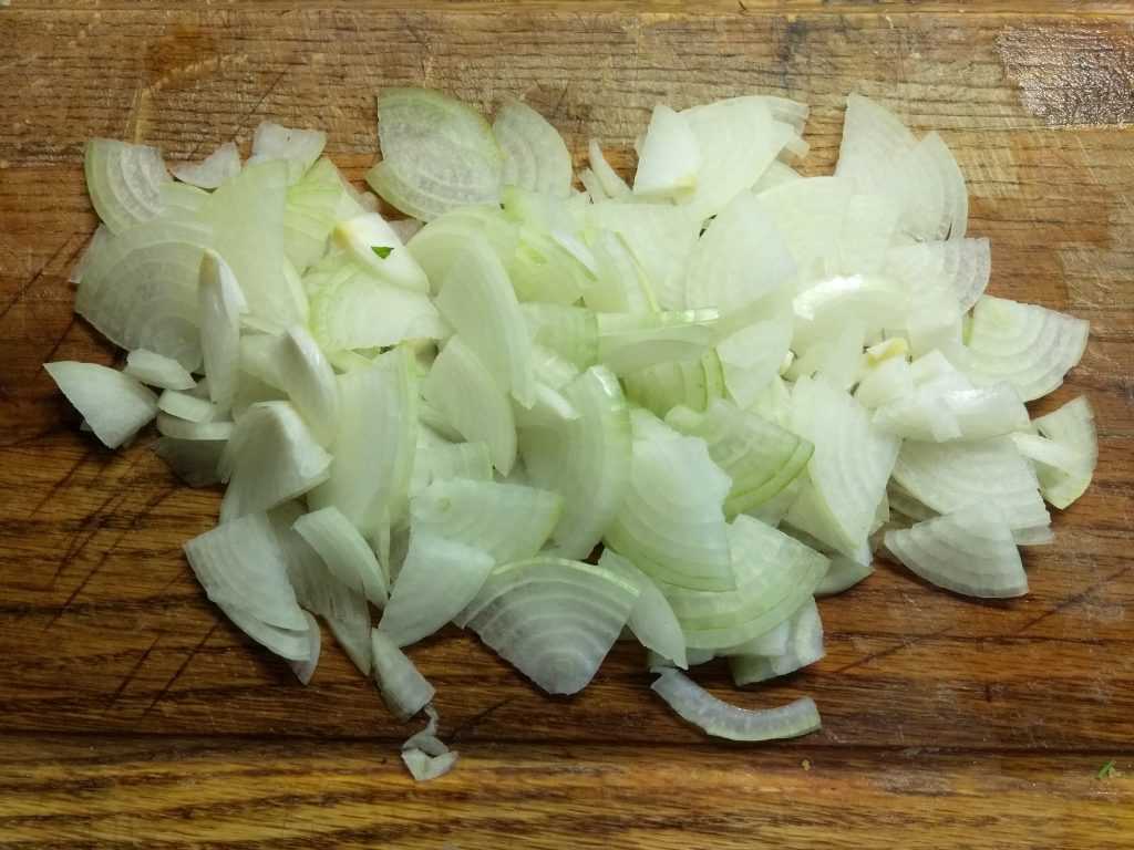 Подготовить все продукты, которые указаны в списке. Очистить красную луковицу, или же взять обычный лук. Нарезать лук кубиками или полукольцами.
