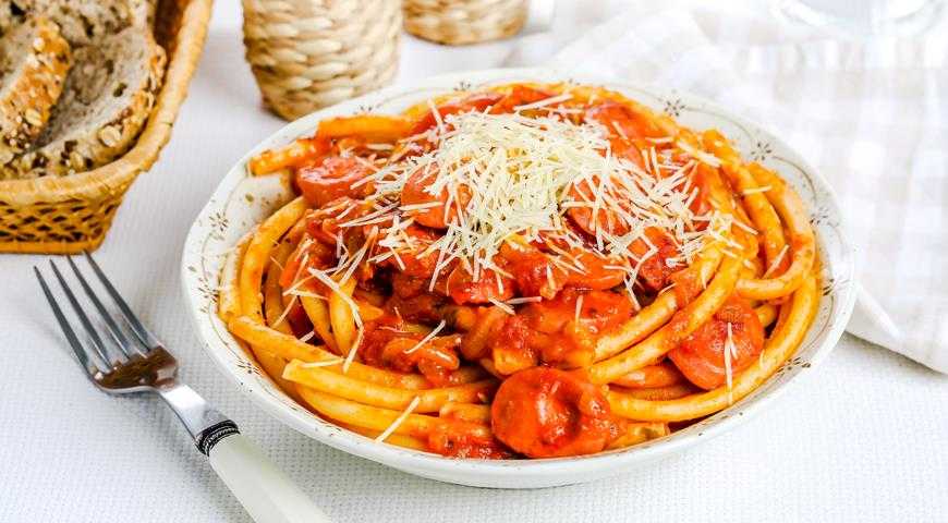 Спагетти с сосисками в томатном соусе — блюдо, не претендующее на принадлежность к высокой кухне. Да и очень полезным его тоже трудно назвать, однако оно вполне имеет право на существование, ведь каждому из нас знакома ситуация, когда хочется поужинать быстро, дешево, но при этом вкусно. Наши спагетти с сосисками как раз отвечают всем вышеуказанным требованиям. Блюдо очень простое в приготовлении, но вы вполне можете усложнить его вкус за счет добавления специй, пряности или любых сушеных трав по вкусу.