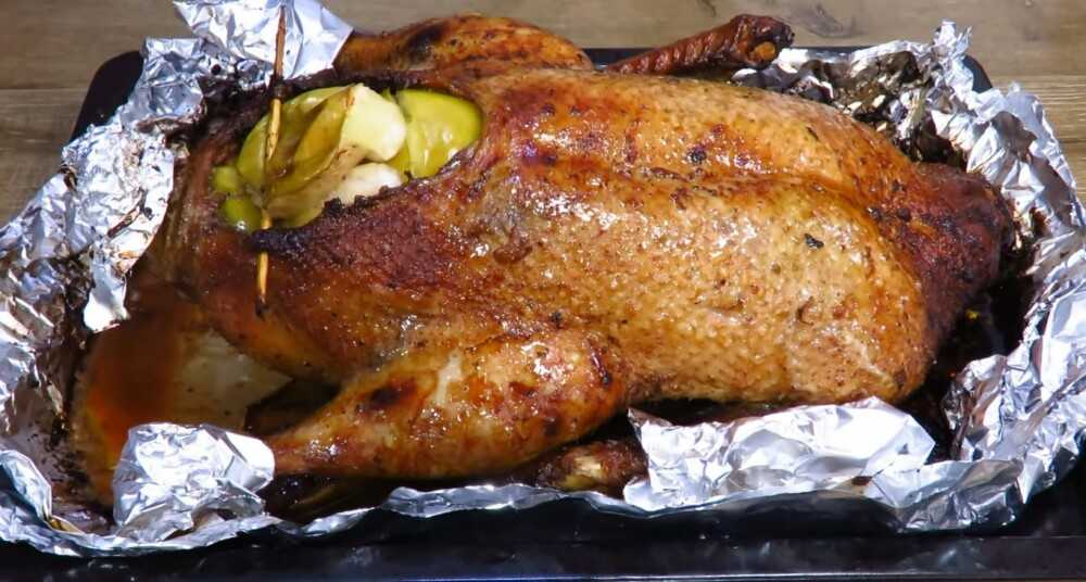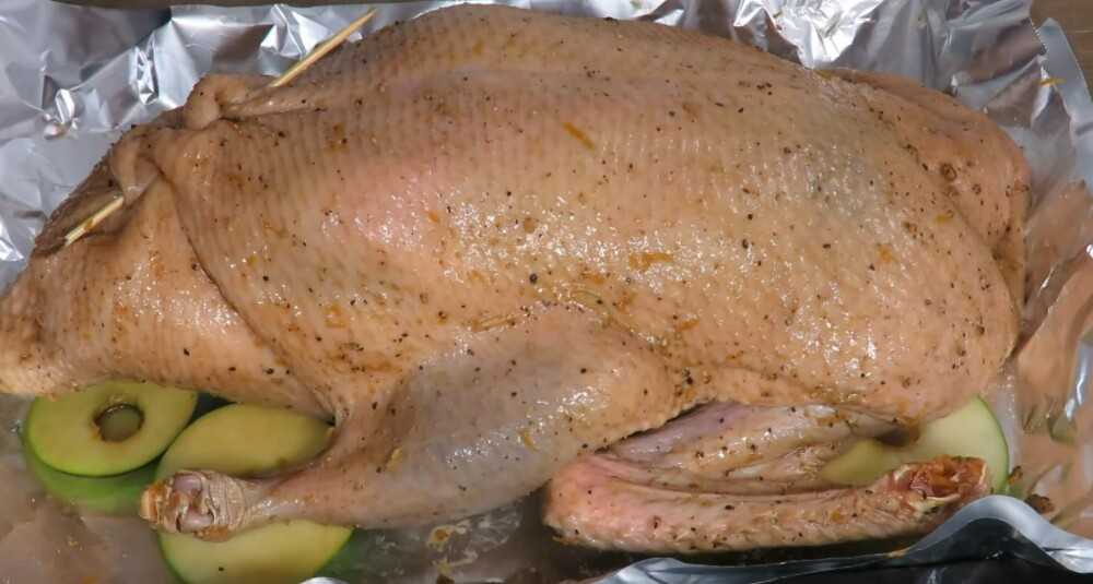 5. Подготовленную утку нарываем фольгой и отправляем запекаться в разогретую до 180 градусов духовку на 1,5 часа.