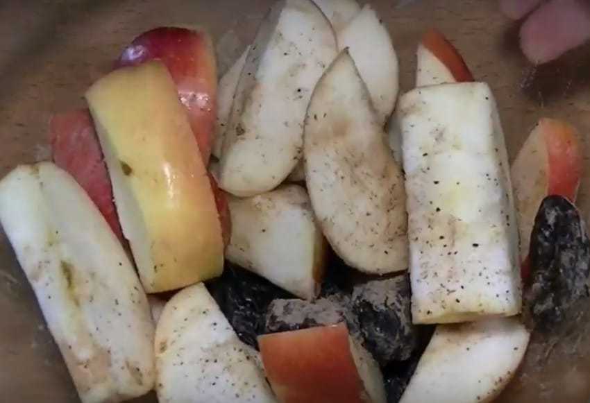 2. Из яблок уберите сердцевину и нарежьте крупными дольками вместе с кожурой. Чернослив залейте кипятком, оставьте на 3 минуты и обсушите бумажным полотенцем.