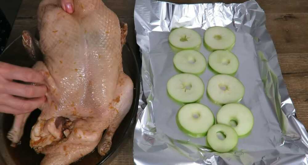 Выдержите тушку в маринаде около 24 часов в холодильнике. За это время несколько раз переверните утку для равномерного распределения маринада. Через сутки для начинки возьмите твердые зеленые яблоки, нарежьте их на четвертинки, очистив от семян. Достаньте из холодильника утку и скрепите надрез на шее зубочистками. Плотно заполните яблоками и также закрепите кожу зубочистками.