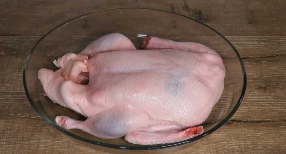 1. Тушку хорошо промойте, просушите бумажными полотенцами, удалите лишний жир. Натрите изнутри и снаружи смесью соли с перцем оставьте на несколько часов в холодильнике.