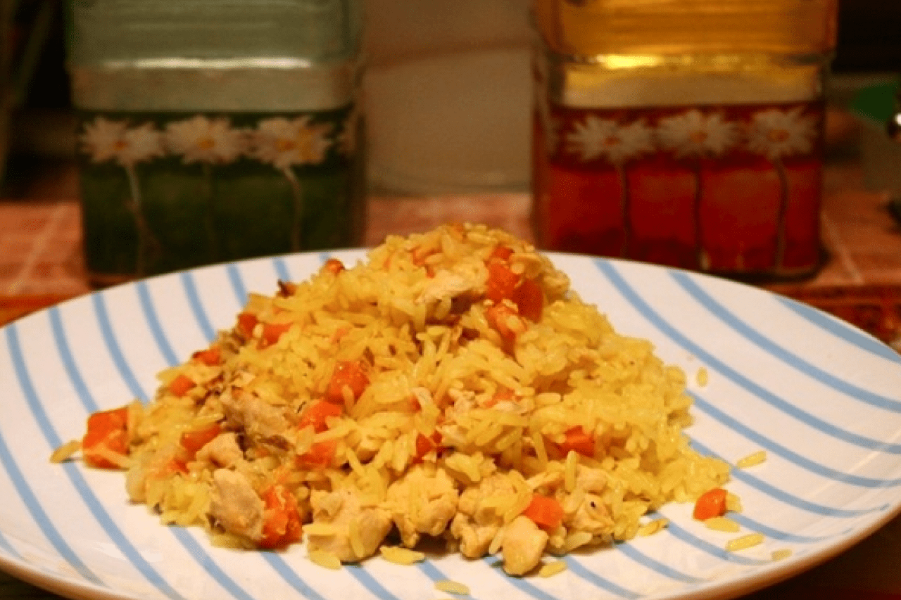 - Отдельно обжаривают мясо, лук, морковь. Только тогда их смешивают, добавляют приправы, укладывают в кастрюлю, а сверху засыпают рис.