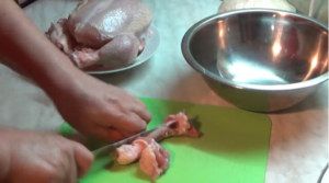 Я обычно беру целую курицу и сначала отделяю мясо от костей вместе с жиром и кожицей. Когда данная процедура завершена — пропускаю все через мясорубку с добавлением репчатого лука.