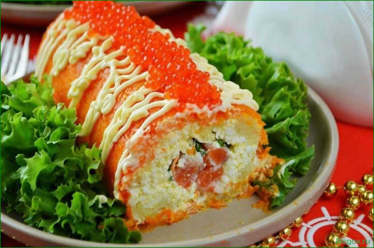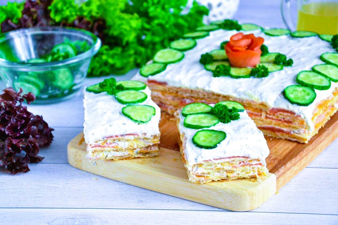Необходимо подготовить ингредиенты. Для ускорения процесса можно использовать готовые коржи, но при желании можно испечь их самостоятельно. Для начинки лучше использовать соленую или подкопченную рыбу, которую предварительно можно заморозить для удобства нарезки. Сыр лучше выбрать без добавок, так как рыба и икра уже содержат достаточно соли.