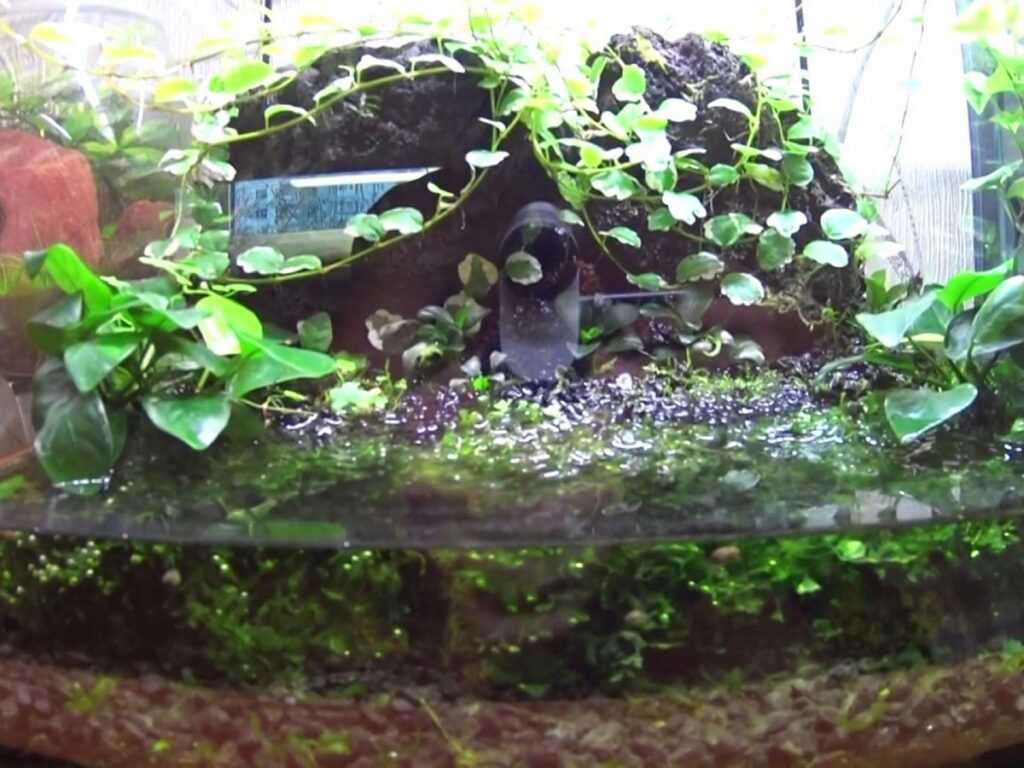 Важно, чтобы его кромка была на одном уровне с поверхностью. Это позволит посадить анубиас так, чтобы корни были в воде, листья – на суше