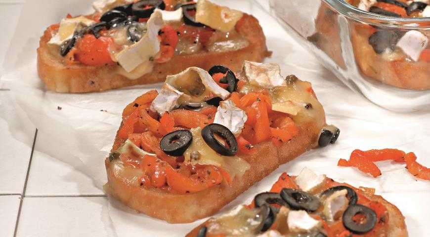 Поместить кусочки хлеба на противень, разложить на них полоски перца, маслины и сыр. Поставить в духовку на 10 мин., затем сразу же подать к столу.