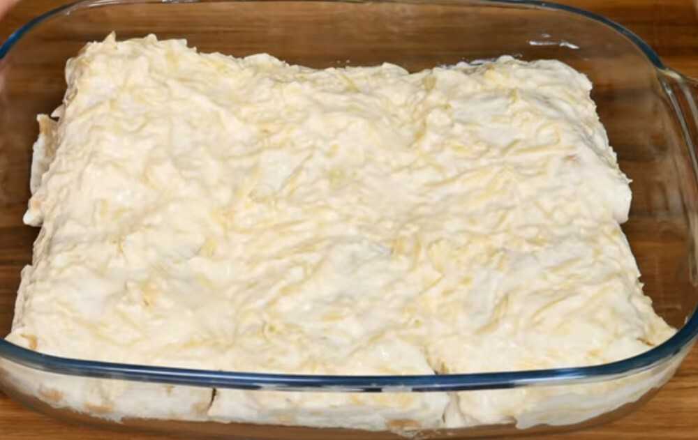 4. В отдельной емкости смешиваем сметану, майонез, стакан воды и чайную ложку соли. Заливаем полученной смесью нашу рыбку.