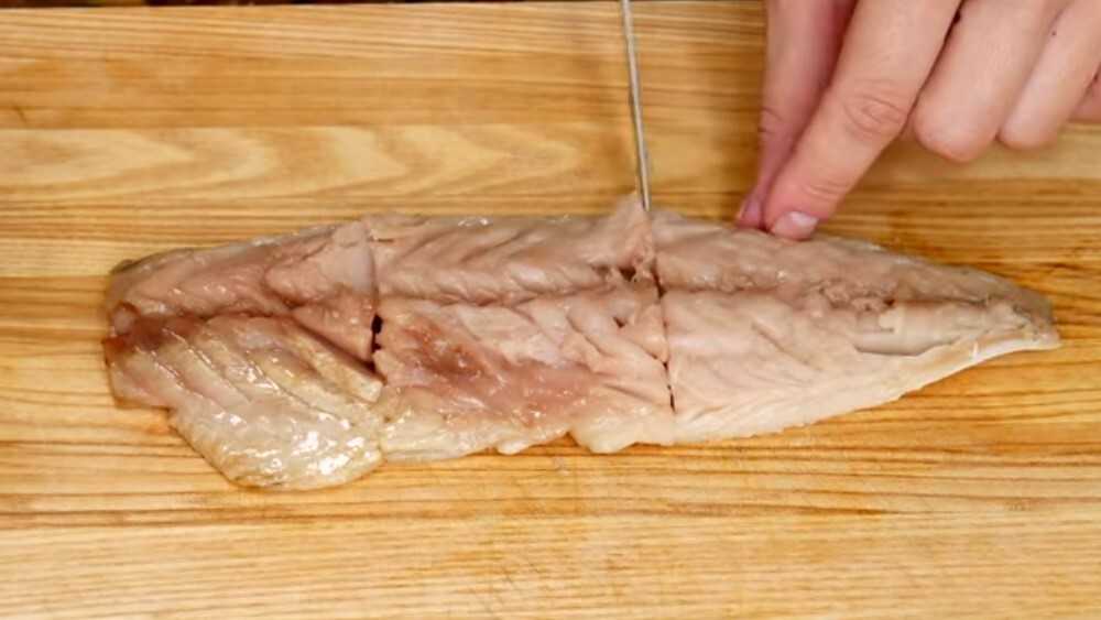 Осторожно острым ножом разрежьте вдоль позвоночника кость и нарежьте ее на филе.