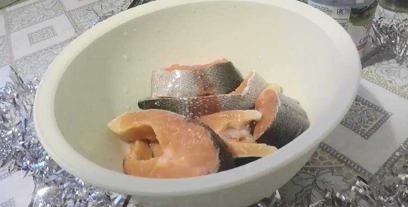 - Нарежьте тушку рыбы стейками. Ополосните, обязательно просушите.