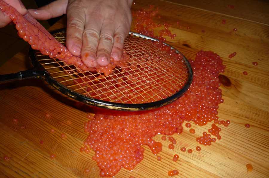 икринки протирают через сито с крупными отверстиями для отделения пленки. Этот метод используют в крупных рыбных хозяйствах, где имеют дело с большим количеством икры. Дома для этих целей можно использовать ракетку для бадминтона или обычную вилку, если требуется засолить малую порцию икры.