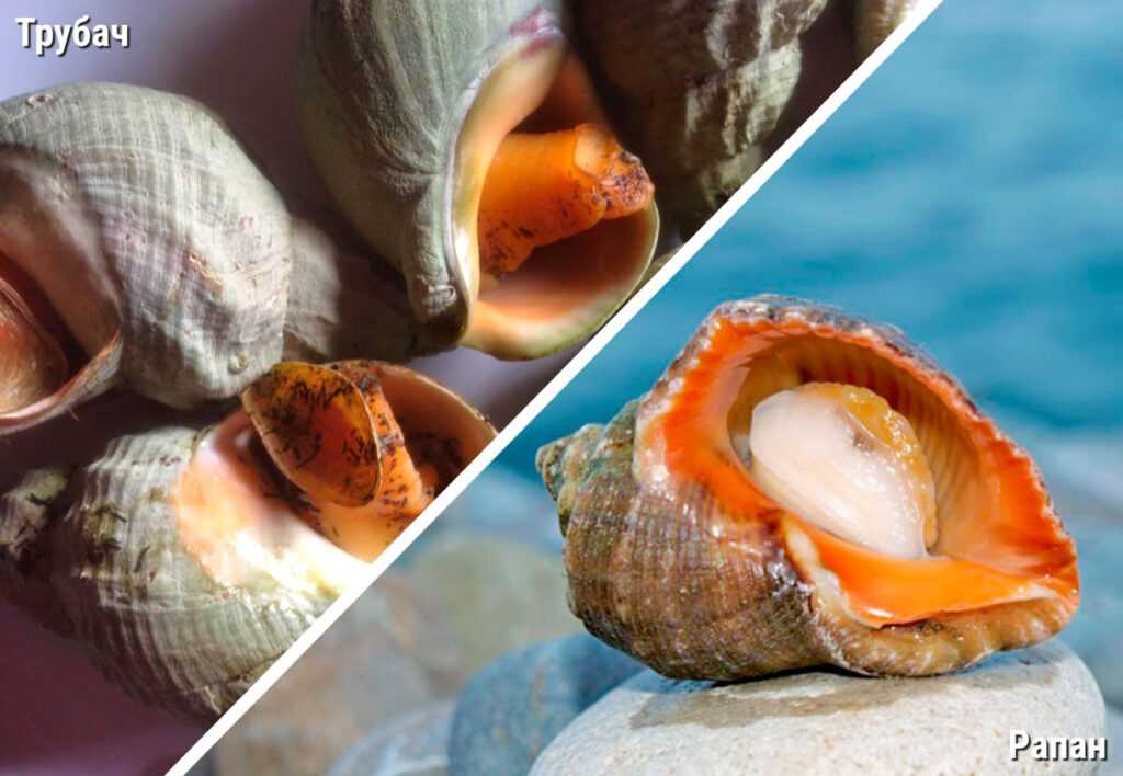 Рапан отличается от другого съедобного брюхоногого моллюска трубача внешним видом, размерами и ареалом обитания: