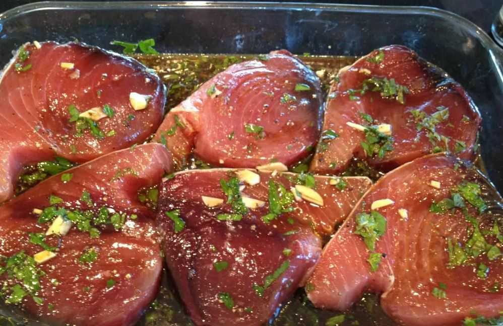 - Перед жаркой рыбу маринуют. На это уходит от 30 минут до 2 часов. Чем меньше куски, тем меньше время маринования тунца.