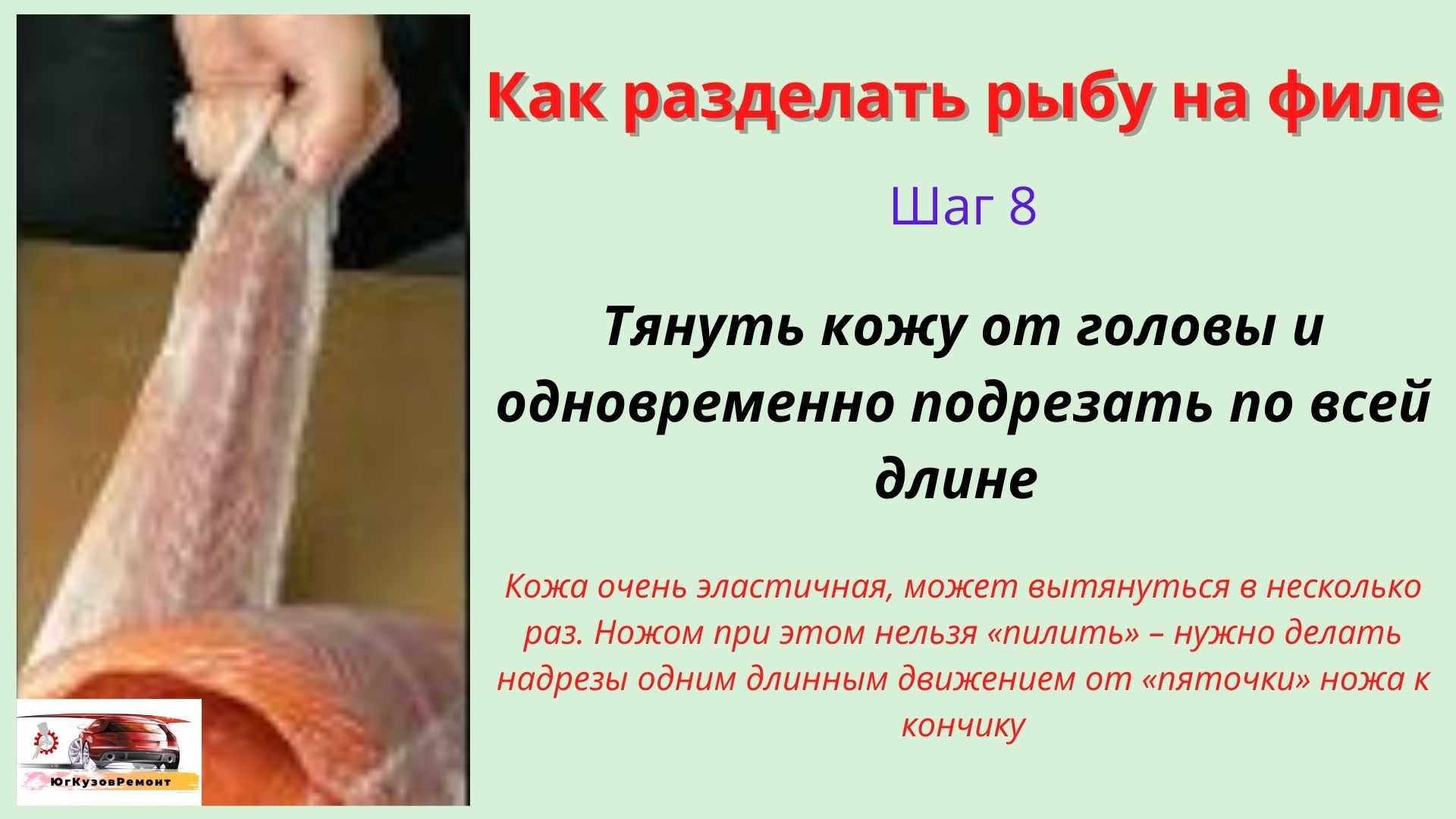 Важное условие — нож должен быть острым, и двигать им надо только вперед, прижимая лезвие к коже при срезании, без пилящих движений, чтобы не превратить нежное филе в рыхлую кашу
