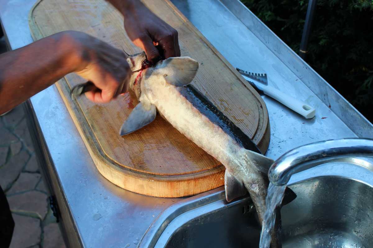 После вскрытия брюшка удобным методом, рукой осторожно извлечь её содержимое, вырезать кишечник и пищевод. Извлечь жабры. Если имеется икра, её возможно отложить и применить в рацион