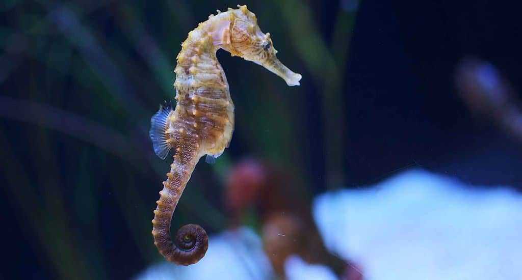 Хвост морского конька очень необычен. Он закрученный и очень гибкий. С его помощью рыба цепляется за кораллы и водоросли, когда прячется.