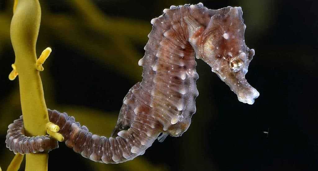 Интересным является хвост морского конька. Он изогнутый, и разгибается только при интенсивном плавании. Таким хвостом морские коньки могут цепляться за объекты, чтобы удерживаться во время сильного течения. Примечательна также брюшная полость морских коньков. Дело в том, что там располагаются репродуктивные органы. У самок это яйцеклад, а у самцов – брюшная сумка, выглядящая как отверстие посередине живота.