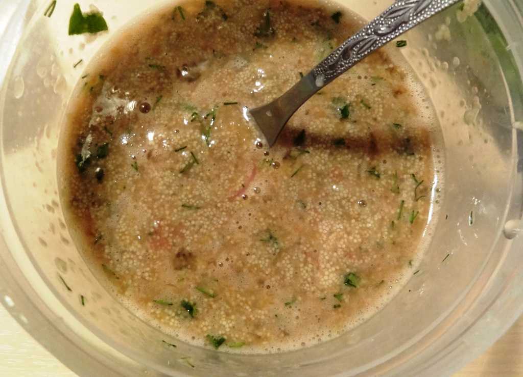 Теперь нам нужно перемешать ингредиенты и взбить вилкой. Только не блендером! И не миксером! Аккуратно взбиваем вилкой до однородной массы.