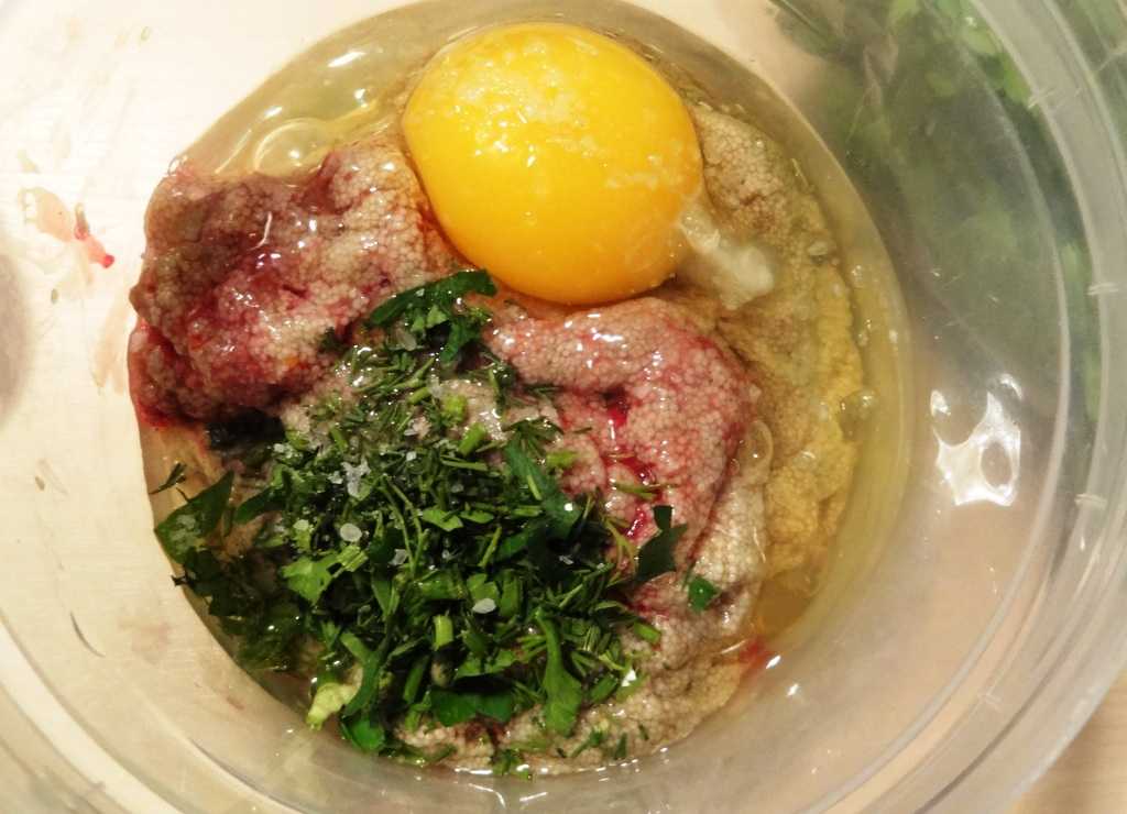Хотя сазан и не особо большой, но икры в нем оказалось прилично! Икру промойте и добавьте очень мелко нарезанный репчатый лук, если есть блендер, измельчите в кашицу. Дальше кладем соль, перчик, яйцо и мелко нарезанную петрушки и укропа. Можно без зелени, но с ней вкуснее и ароматнее!