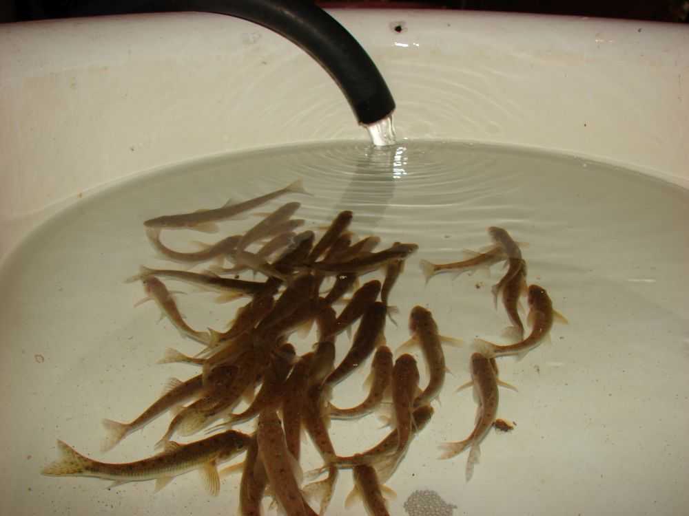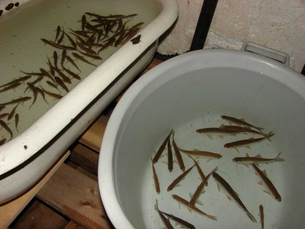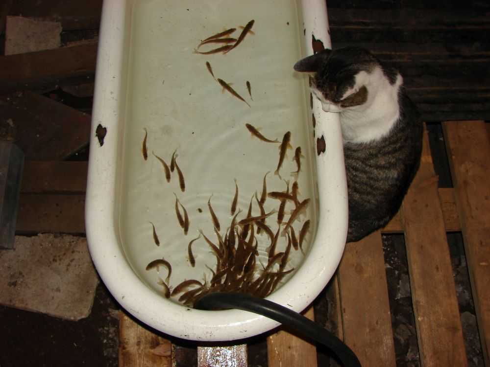 И, в-третьих, довольно часто живец просто-напросто выпрыгивает из ванны. Почему так происходит? Новая непривычная среда обитания, стресс от переезда, непонятные шумы в непосредственной близости — и, пожалуйста, обязательно находится несколько рыбешек, которые или в момент загрузки их в ванну, или, особенно, при смене воды, а иногда и просто в тот момент, когда вы бросаете корм или проверяете их состояние, обязательно попробуют ванну покинуть.