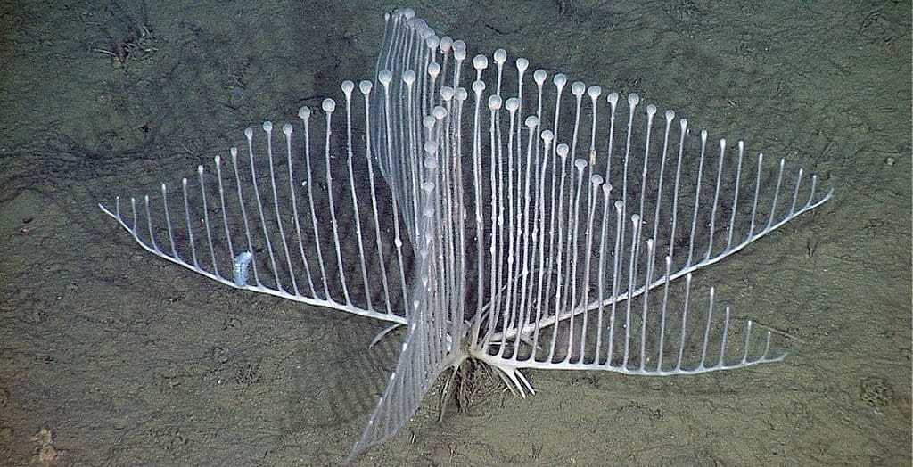Глубоководная плотоядная губка, имеющая внешнее сходство с арфой или лирой. Впрочем, больше она похожа на канделябр с горизонтальными подставками (от 2 до 6) с множеством поставленных на них свечек. Впервые обнаружена совсем недавно у калифорнийских берегов на глубине более 3км. Своими свечками-щупальцами губка захватывает добычу, которую ей по силам удержать, и обволакивает ее выделяемой из тела пищеварительной мембраной. Когда еда будет переварена, губка-лира всосет добычу через свои поры. В длину достигает 60см, что делает ее самой крупной среди описанных наукой сородичей.