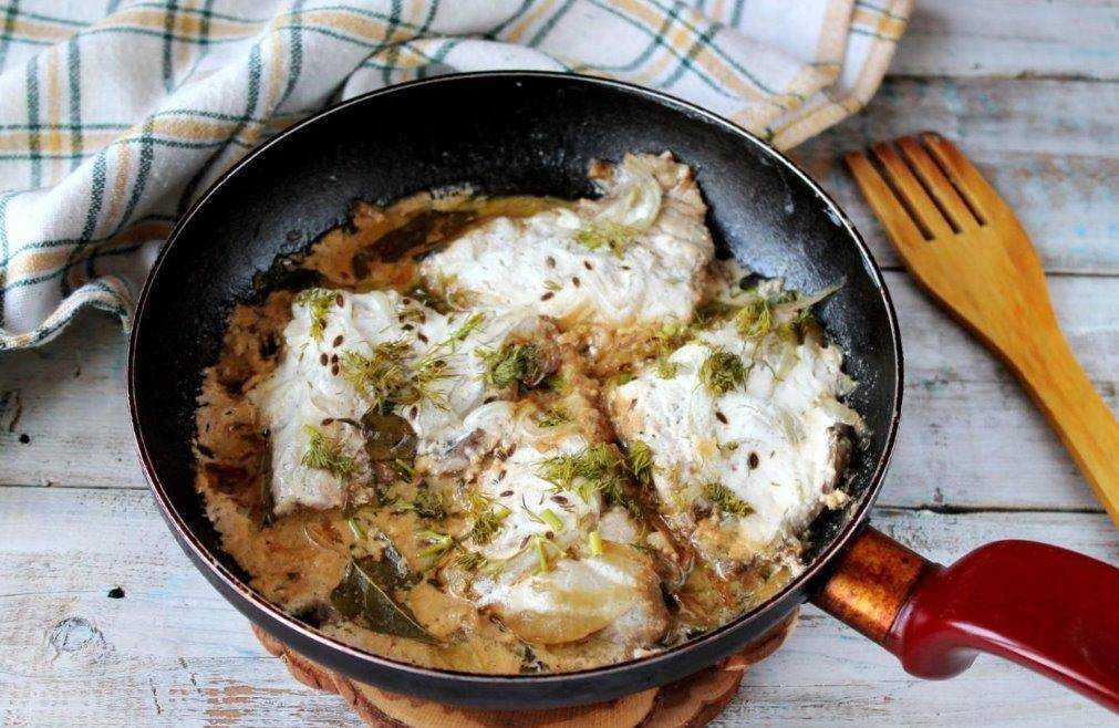 Для тушения выбирают рыбу нежирных сортов и содержащую много мелких костей. Это связано с тем, что в процесс термообработки мелкие косточки разрываются, становясь незаметными, а насыщенность вкуса достигается за счет приправ. У свежей рыбы отрезают головы и хвосты, которые ставят вариться. Тушку разделывают на куски и, обваляв в муке, слегка поджаривают на постном масле. Мясо хека или минтая водянистое, поэтому рекомендуется перед началом приготовления, выдержать 30 минут тушку в сильно — соленой воде, чтобы при жарке куски не разваливались на сковородке. Затем готовится «луковая» подушка из нарезанных полукольцами и поджаренных 4-х луковиц. Половина подготовленного лука выкладывается в сотейник и на него выкладываются душистый перец, лист лавра, гвоздика и по щепотке соли и сахара. Затем выкладываются куски рыбы, и засыпается вторая половина подготовленного лука. Залив небольшим количеством бульона, ставим варить на слабый огонь.