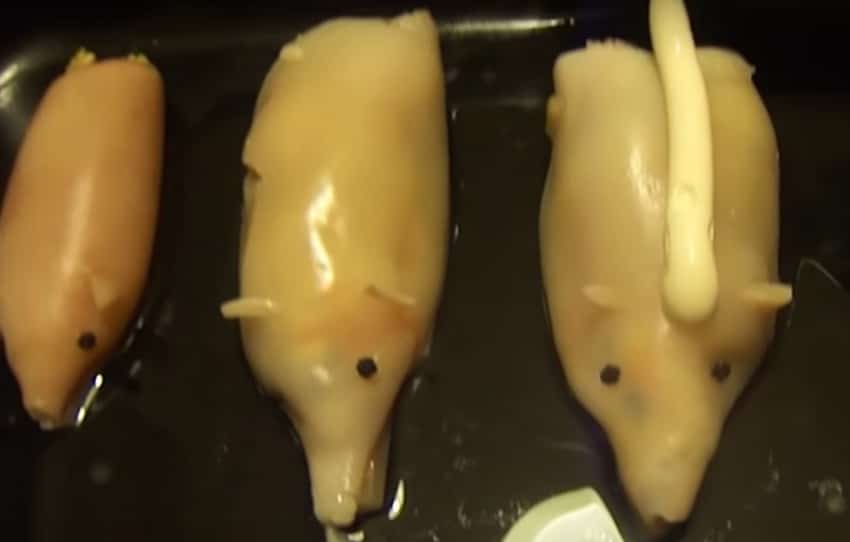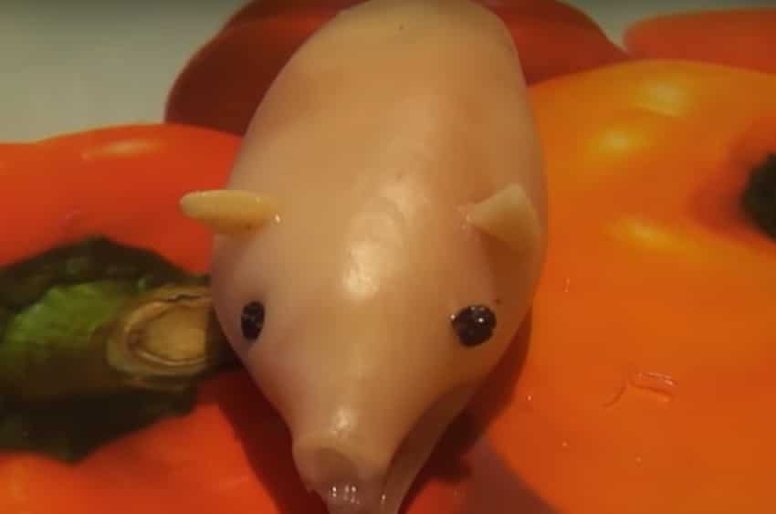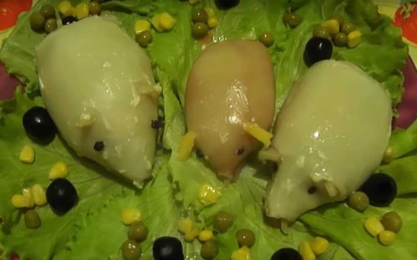 Эти вкусные поросята были специально подготовлены к празднику 2019 года. В основе рецепта — тушки кальмаров. Начинка состоит из риса, крабов, кукурузы, яиц и сметаны. Она заливается розовым соусом. Их оставляют на некоторое время в