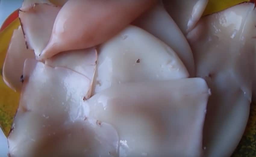 1. Тушки кальмара размораживаем, очищаем, промываем и обдаем кипятком.