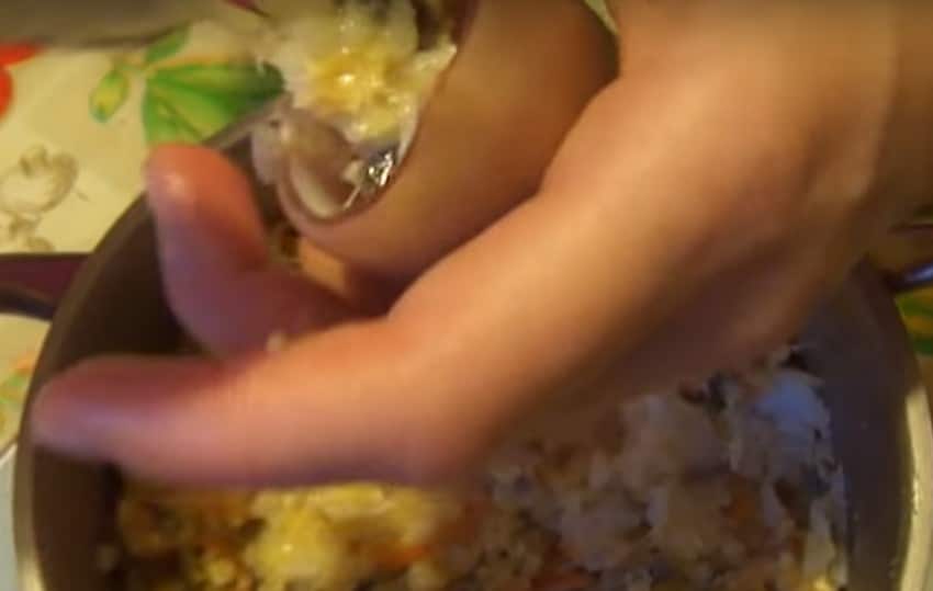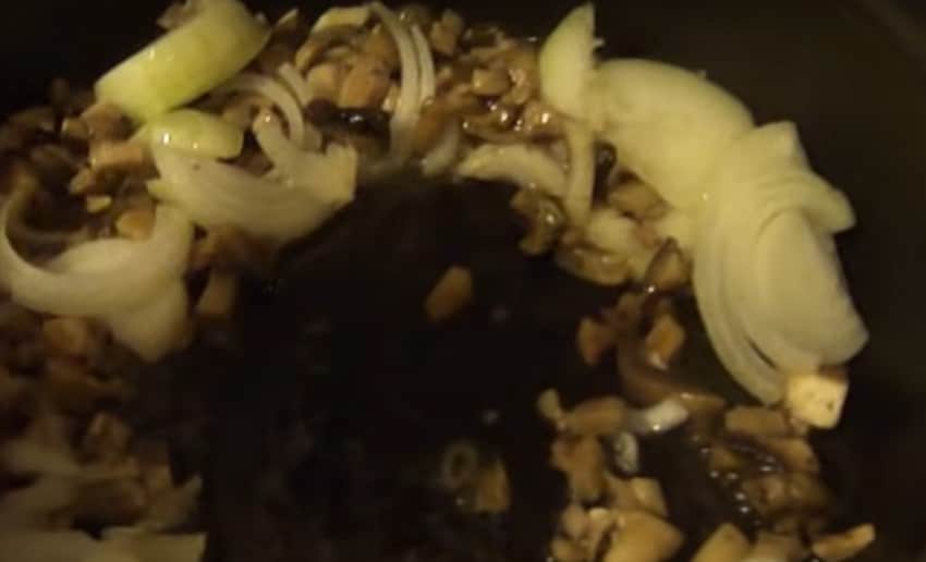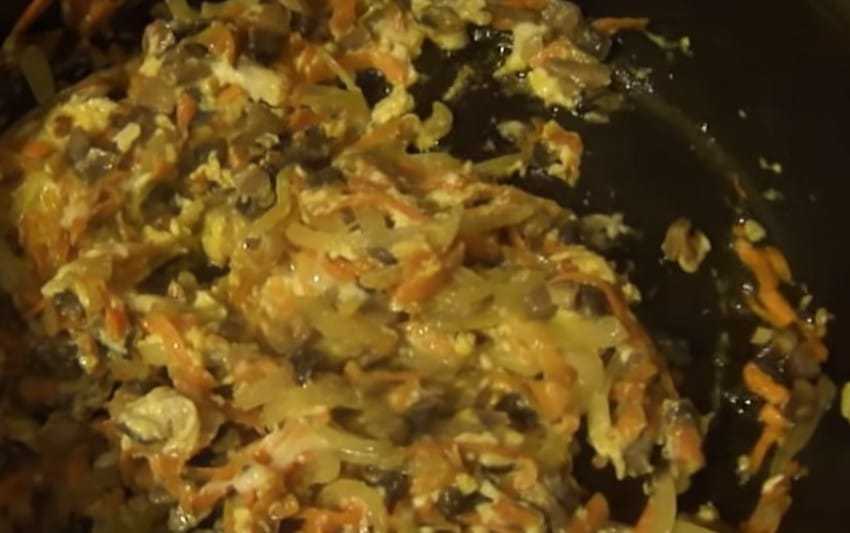 - После сигнала таймера выложите на сковороду рисовую крупу. Влейте воду, проследите, чтобы её уровень превышал на сантиметр содержимое сковороды. Дождитесь закипания, тушите 15-20 минут.