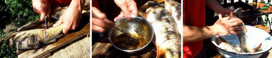 - Карпа следует выпотрошить, промыть, и крупно нарезать. Чем крупнее будут куски рыбы, тем безопаснее готовить филе на костре. Поскольку рыбное мясо очень нежное, есть опасность, что оно может порваться на шампуре, и упасть в костёр (в случае приготовления на мангале эта опасность не так страшна). Поэтому для приготовления на костре на шампурах, рыбку разделывают, не вынимая хребет и не разрезая брюхо. Для разделки нужно отрезать голову, и через отверстие вынуть внутренности. Нарезанные для нанизывания куски также должны быть крупными. Шкурку снимать нельзя ни в коем случае.