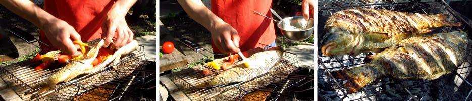 Угли для рыбы должны быть умеренно горячими, так что бы рука выдержала 2 сек. на расстоянии 15 см. Как только рыбка начнет шкварчать, переворачиваем решетку, смазываем смесью для жарки. Таким образом минут 15-20 до равномерной золотистой корочки.