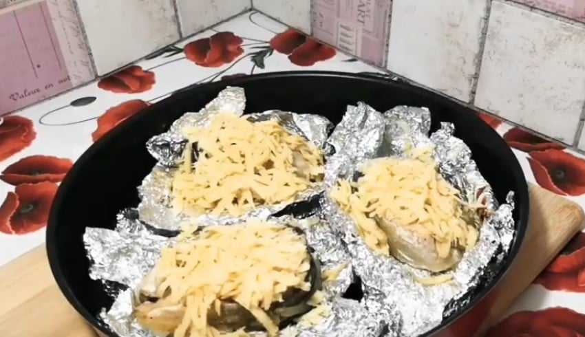 - Фольгу плотно заворачиваем и выкладываем на противень. Запекаем в духовке при 200 градусах минут 20. Подавать в горячем виде. Приятного аппетита!