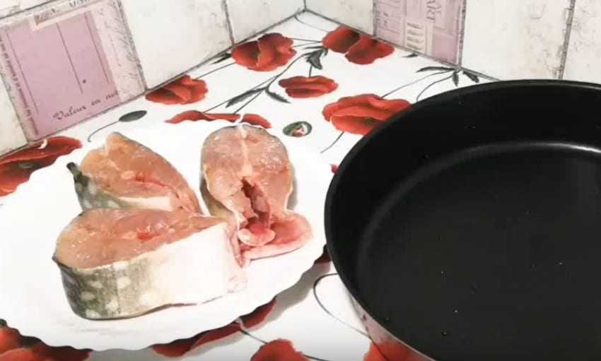 1. Тушку очистите от внутренностей, удалите голову и плавники. Разделите на стейки. Или используйте уже готовые стейки. Все кусочки внутри и снаружи натрите солью, и поперчите по вкусу. Луковицу нарежьте полукольцами.