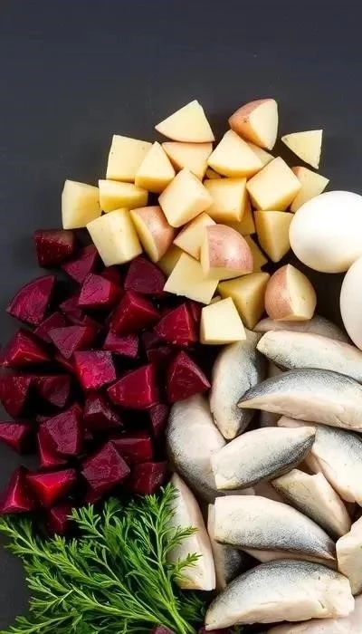 Ингредиенты: сельдь, картофель, свекла, лук, растительное масло, уксус. Приготовление: Картофель и свеклу отварить и нарезать кубиками. Лук мелко нарезать и замариновать в уксусе. Сельдь нарезать кубиками. Смешать все ингредиенты и заправить маслом.