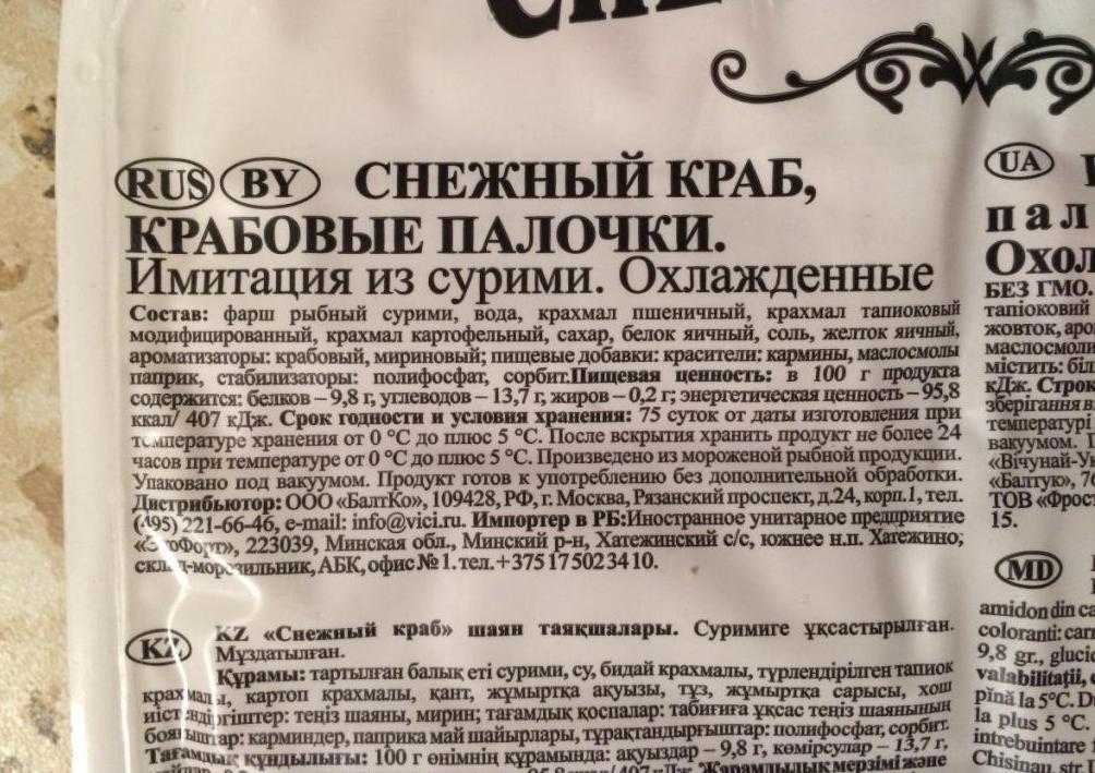 . В составе сурими, крахмал пшеничный, масло, яичный белок, сахар, соль поваренная и пищевые добавки. Опасных консервантов и усилителя глутамата натрия в числе компонентов нет; -