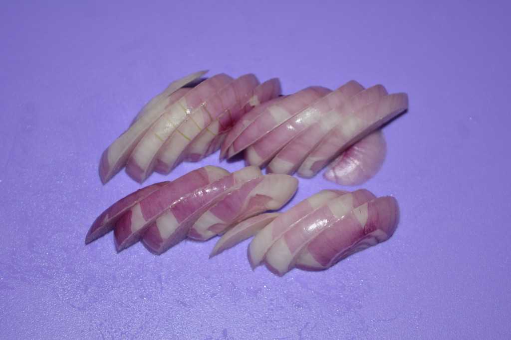 - Нарежьте лук полукольцами, добавьте на сковороду к мясу и жарьте до готовности мяса. Присолите.