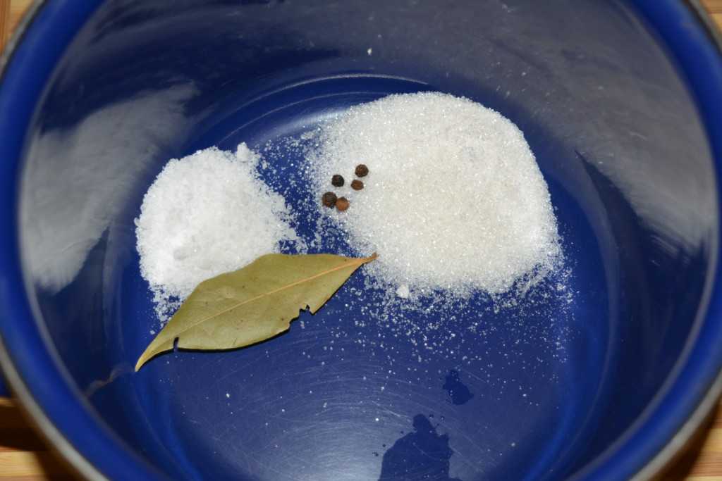 - В воду все специи, кроме чеснока, а также сахар, соль. Дождаться закипания, а потом варить 5 минут (на маленьком огне). После этого маринад должен остыть.