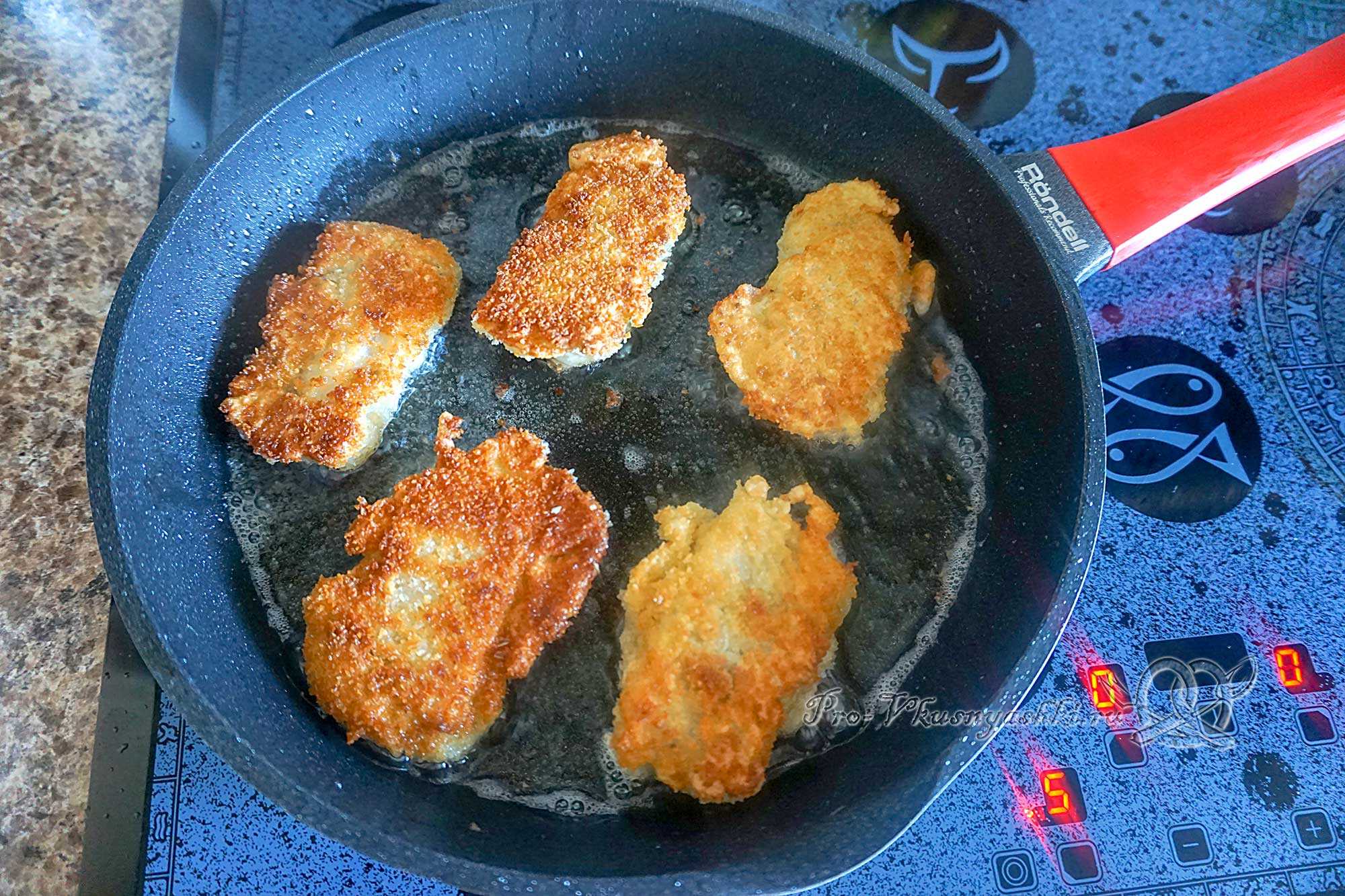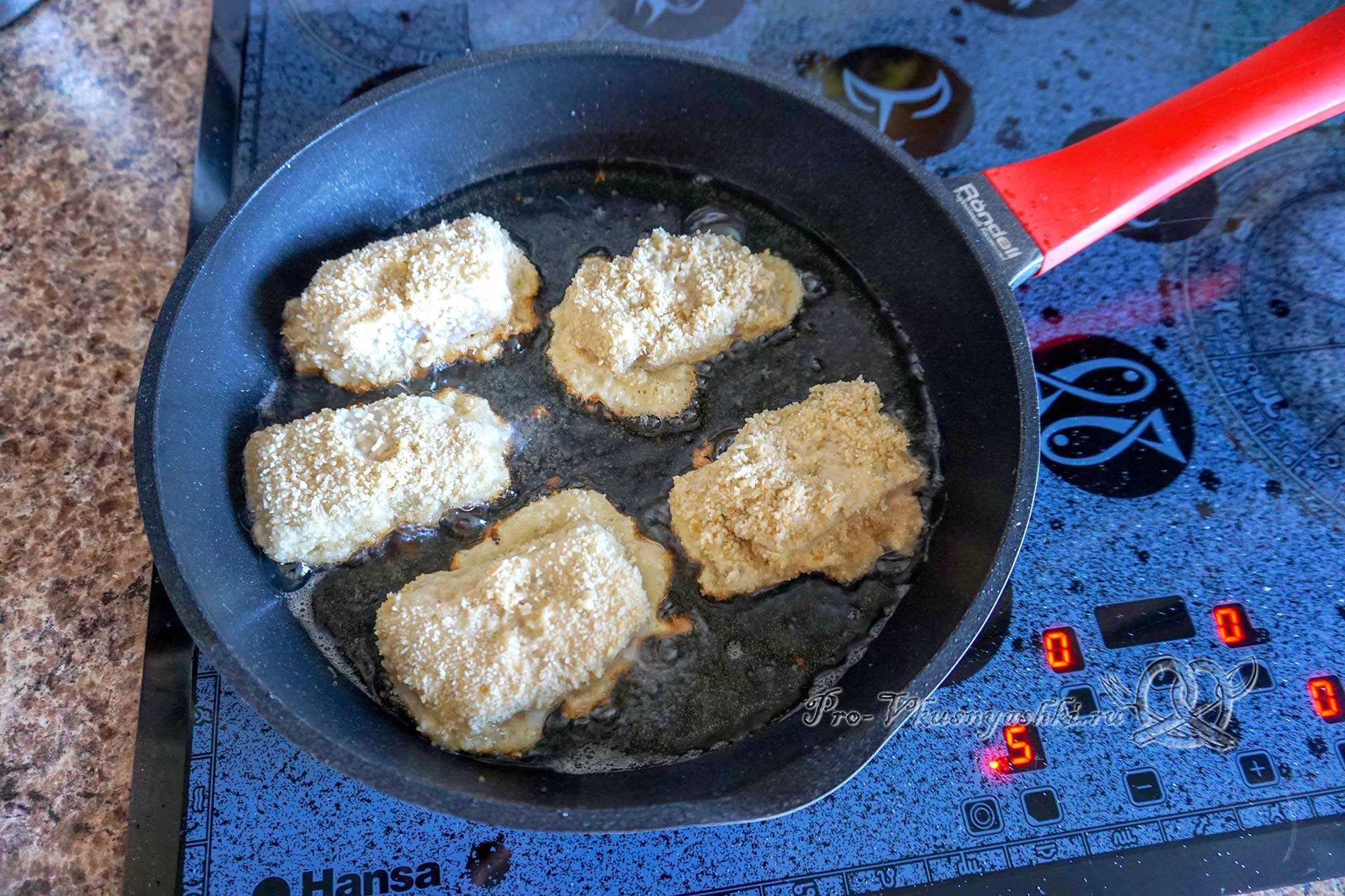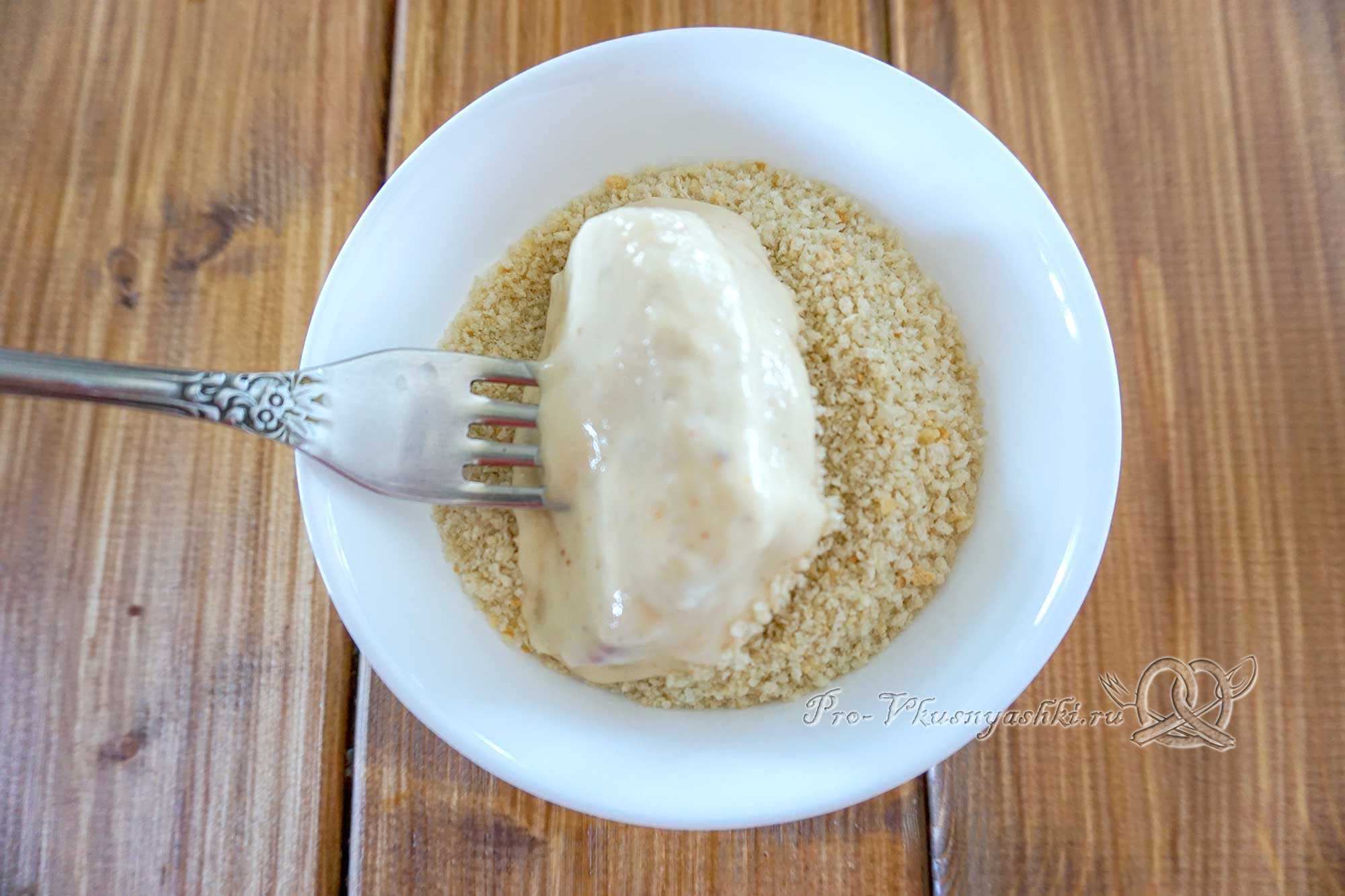 Чтобы корочка на филе была более привлекательной и хрустящей, помещаем заготовки в панировочные сухари таким образом, чтобы хлебная крошка покрыла всю поверхность изделий.