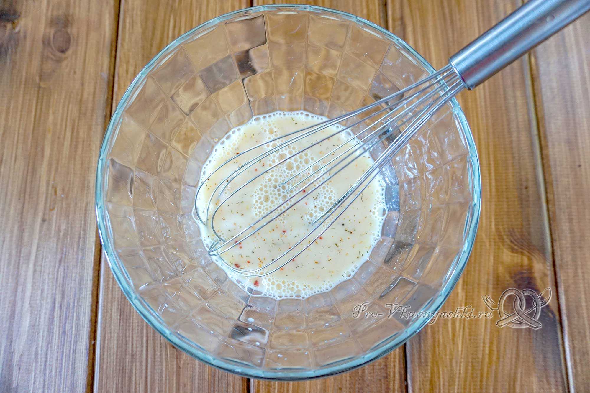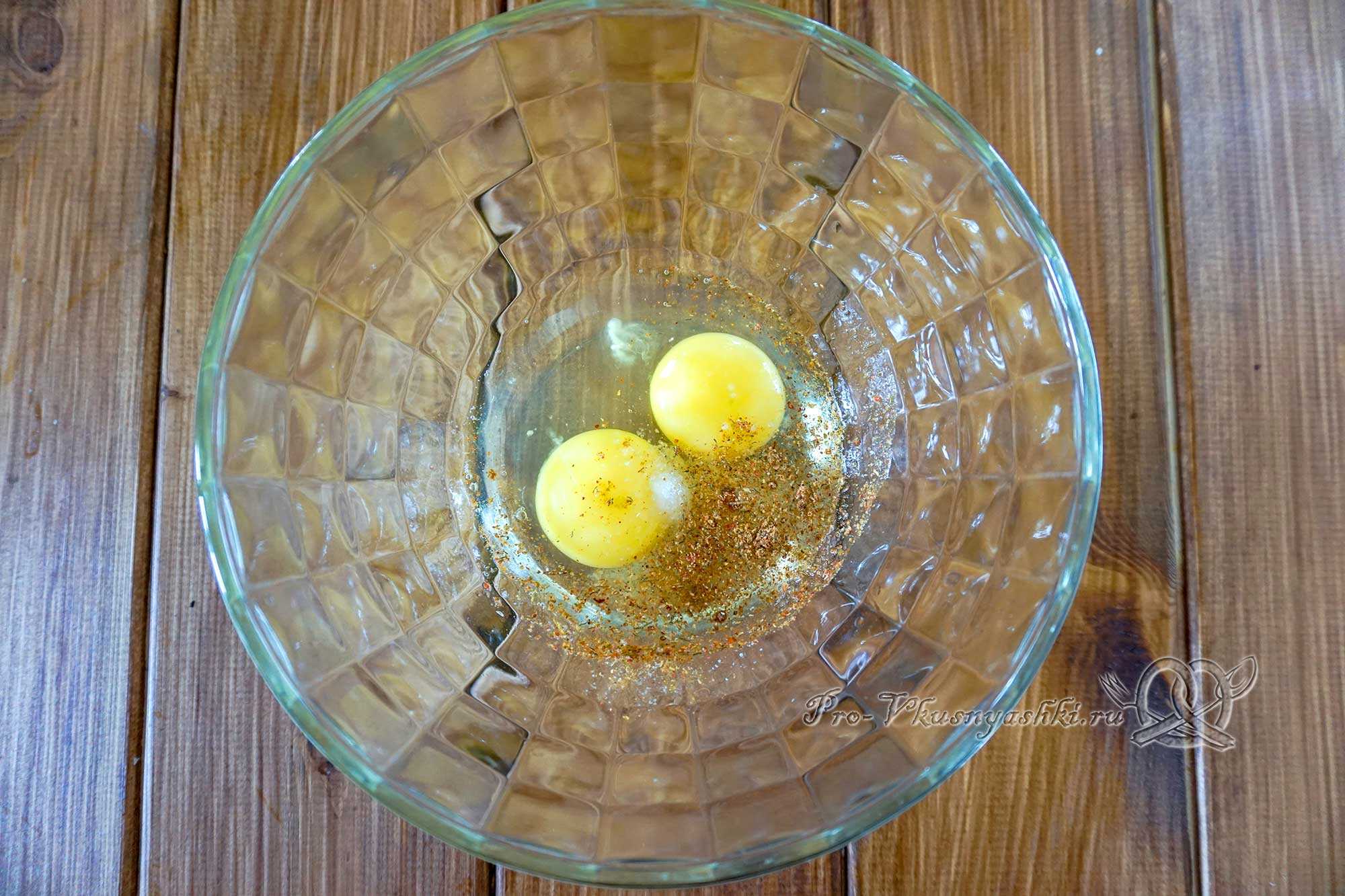 Сначала приготовим кляр. В глубокую миску разбиваем яйца, добавляем соль и специи. Взбиваем смесь при помощи венчика или миксера, пока соль не растворится.