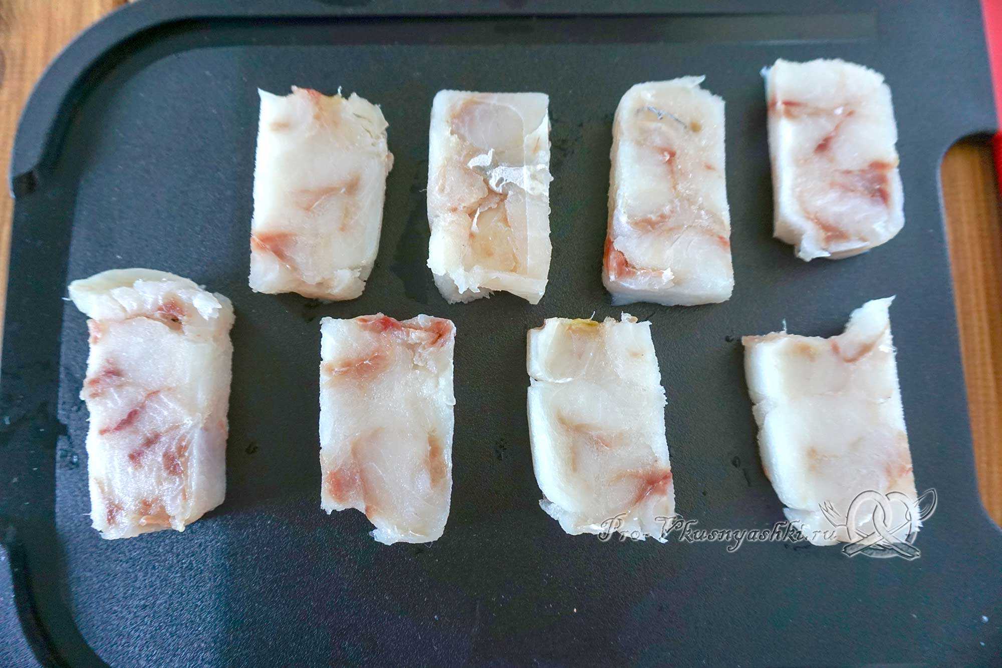 Теперь подготовим рыбу. Нарезаем ее небольшими прямоугольниками, у меня их размеры примерно 6х3 см.