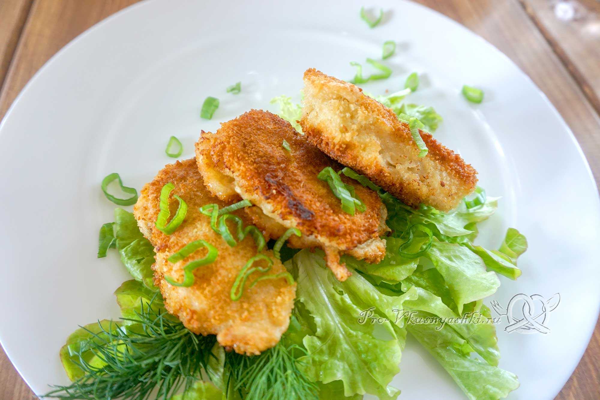 Подаем это вкусное, хрустящее снаружи и очень нежное и сочное внутри блюдо с зеленью. В качестве гарнира можно использовать овощи или крупы.