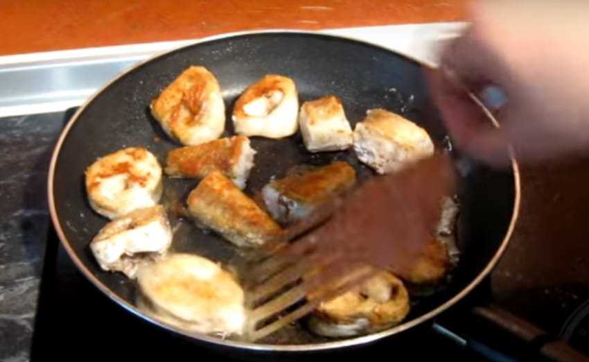 ΠΡΠ΅Π΄Π²Π°ΡΠΈΡΠ΅Π»ΡΠ½ΠΎ ΡΠ°Π·ΠΌΠΎΡΠΎΠ·ΠΈΠ² ΡΡΠ±ΠΈΠ½Ρ ΠΈ ΡΠ΄Π°Π»ΠΈΠ² Ρ Π½Π΅Π΅ ΠΎΡΡΠ°ΡΠΊΠΈ Π²ΠΎΠ΄Ρ, Π΅Π΅ Π½Π΅ΠΎΠ±Ρ ΠΎΠ΄ΠΈΠΌΠΎ ΡΠ»Π΅Π³ΠΊΠ° ΠΏΠΎΡΠΎΠ»ΠΈΡΡ. ΠΡΡΡΠΏΠ°Π² Π² ΠΌΠΈΡΠΊΡ ΠΌΡΠΊΡ, ΡΡΠ±ΠΊΡ Π½ΡΠΆΠ½ΠΎ ΠΎΠ±ΠΌΠ°ΠΊΠΈΠ²Π°ΡΡ Π² Π½Π΅Π΅ Ρ Π΄Π²ΡΡ ΡΡΠΎΡΠΎΠ½. ΠΡΠΊΠ»Π°Π΄ΡΠ²Π°ΡΡ Π΅Π΅ Π½ΡΠΆΠ½ΠΎ Π½Π° ΡΠΊΠΎΠ²ΠΎΡΠΎΠ΄Ρ Ρ ΡΠ°Π·ΠΎΠ³ΡΠ΅ΡΡΠΌ ΠΌΠ°ΡΠ»ΠΎΠΌ. ΠΡΠΊ Π½Π΅ΠΎΠ±Ρ ΠΎΠ΄ΠΈΠΌΠΎ ΠΏΠΎΡΠ΅Π·Π°ΡΡ ΡΠΎΠ½ΠΊΠΈΠΌΠΈ ΠΏΠΎΠ»ΡΠΊΠΎΠ»ΡΡΠ°ΠΌΠΈ ΠΈ Π²ΡΠΊΠ»Π°Π΄ΡΠ²Π°ΡΡ Π² ΡΠΊΠΎΠ²ΠΎΡΠΎΠ΄ΠΊΡ, ΠΎΠ΄Π½ΠΎΠ²ΡΠ΅ΠΌΠ΅Π½Π½ΠΎ Ρ ΡΡΠ±ΠΎΠΉ. Π§Π΅ΡΠ½ΠΎΠΊ ΡΠ»Π΅Π΄ΡΠ΅Ρ ΠΈΠ·ΠΌΠ΅Π»ΡΡΠΈΡΡ Π½Π° ΠΌΠ°Π»Π΅Π½ΡΠΊΠΈΠ΅ ΠΊΡΡΠΎΡΠΊΠΈ ΠΈ ΡΠΎΠΆΠ΅ Π΄ΠΎΠ±Π°Π²ΠΈΡΡ Π² ΡΠΊΠΎΠ²ΠΎΡΠΎΠ΄Ρ. ΠΠ΄Π½ΠΎΠ²ΡΠ΅ΠΌΠ΅Π½Π½Π°Ρ ΠΆΠ°ΡΠΊΠ° Π»ΡΠΊΠ°, ΡΠ΅ΡΠ½ΠΎΠΊΠ° ΠΈ ΠΌΠΎΠΉΠ²Ρ ΠΏΡΠΈΠ΄Π°ΡΡ ΡΡΠ±Π΅ ΠΏΡΠΈΡΡΠ½ΡΠΉ ΠΈ ΠΎΡΠΈΠ³ΠΈΠ½Π°Π»ΡΠ½ΡΠΉ Π²ΠΊΡΡ.