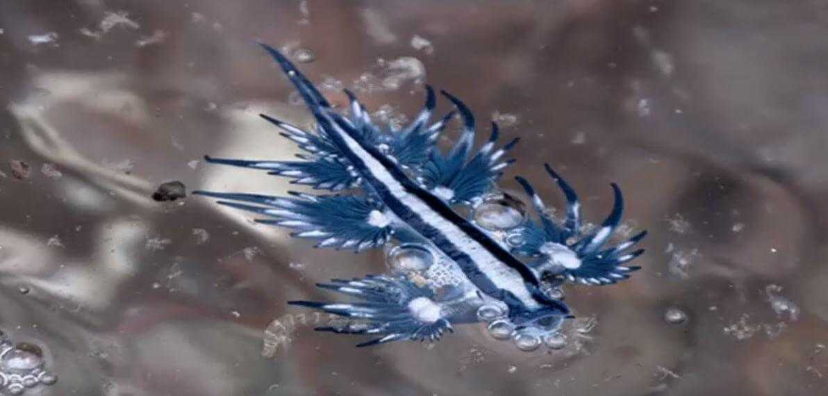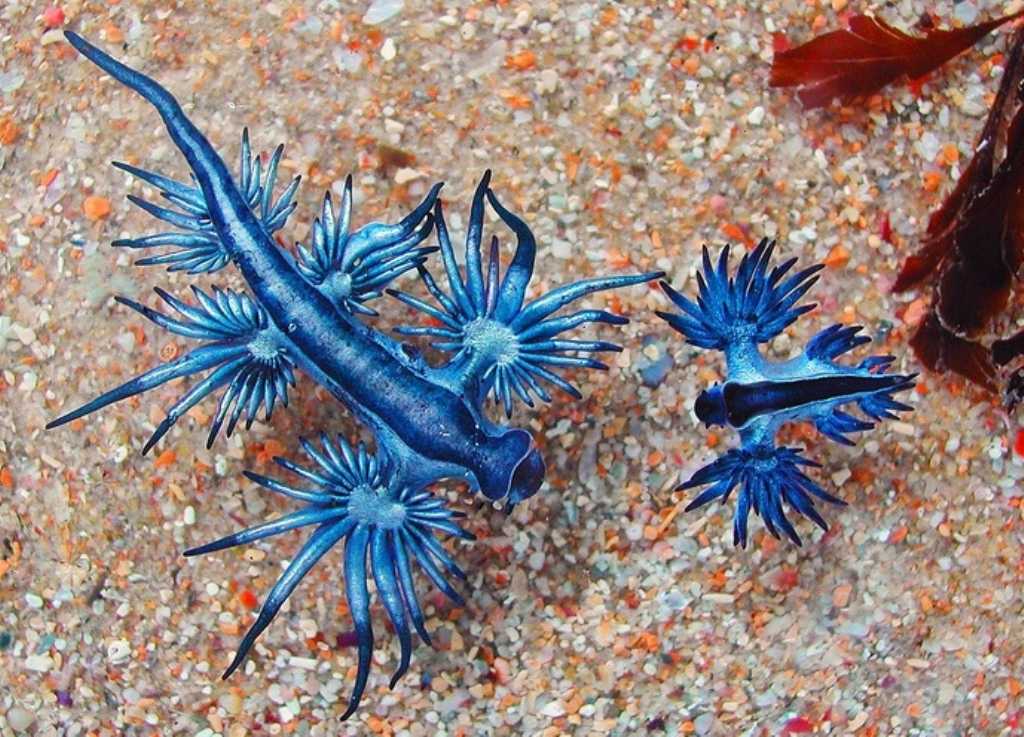Эти захватывающие дух существа не попадаются на глаза людей, кроме тех дней, когда ветер направляет их в прибрежные воды, а иногда волны даже выбрасывают голубых драконов на берег.