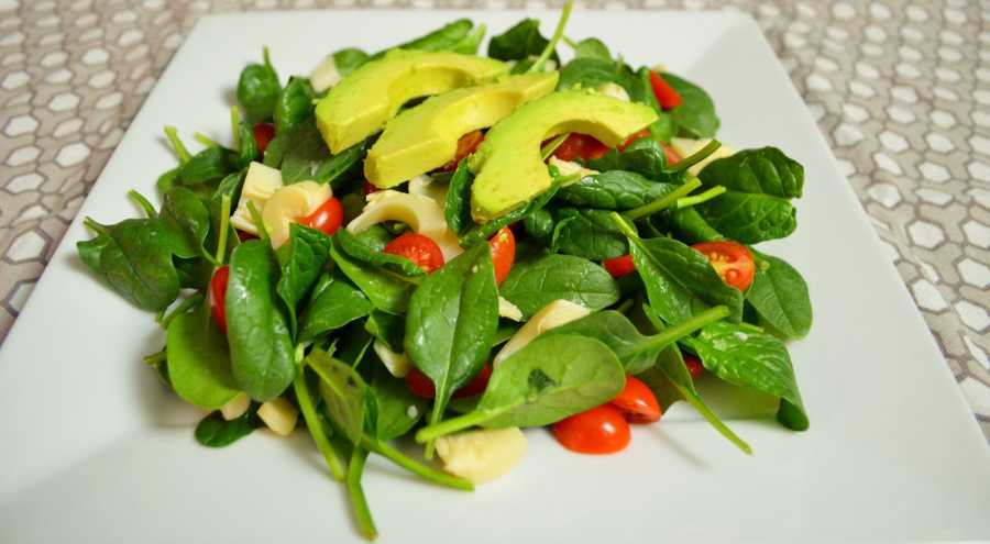 Выложите на тарелку шпинат, а сверху порезанные на четыре части помидоры и кубики авокадо. Сбрызните это все лимонным соком. Отваренные креветки порежьте небольшими кусочками, смешайте с мидиями и распределите поверх авокадо. Затем выложите слой тонко нарезанного огурца. Для этого воспользуйтесь овощерезкой. Полейте салат заправкой из масла, оставшегося лимонного сока, молотого перца с щепоткой соли.