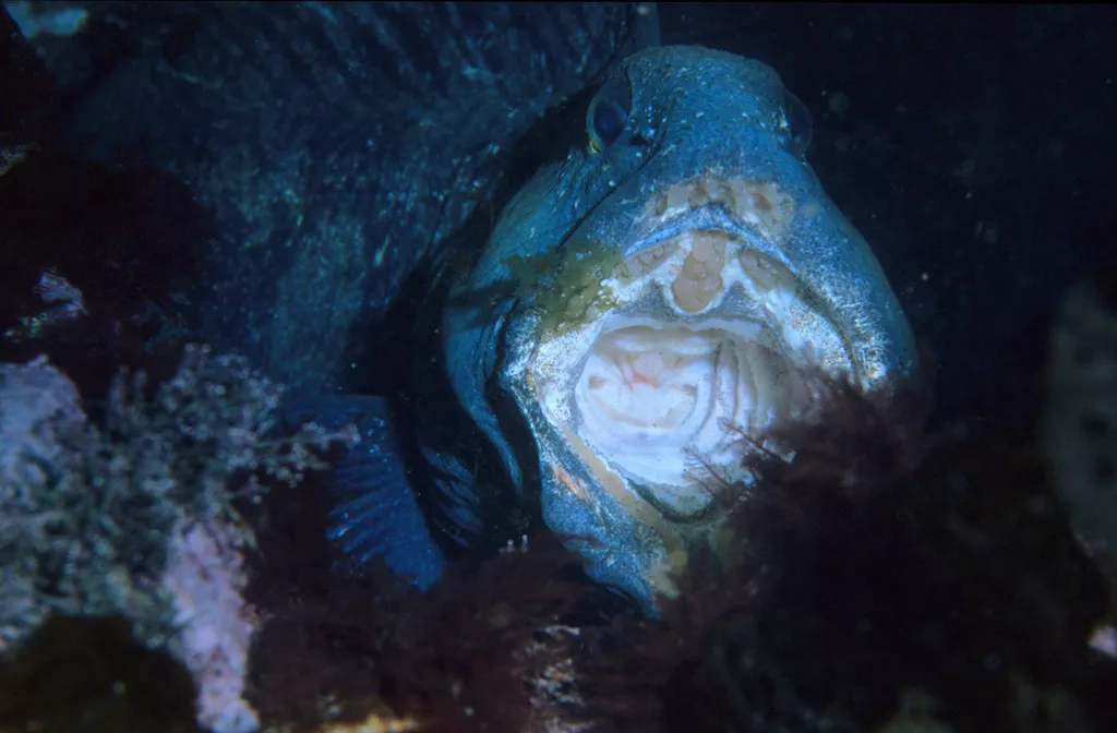Эти одиночные рыбы вырастают до 1,5 метра в длину и могут весить до 18 килограмм. Хотя изображенная здесь синяя зубатка имеет синий цвет, она также может быть пурпурно-коричневой или тускло-оливково-зеленой.